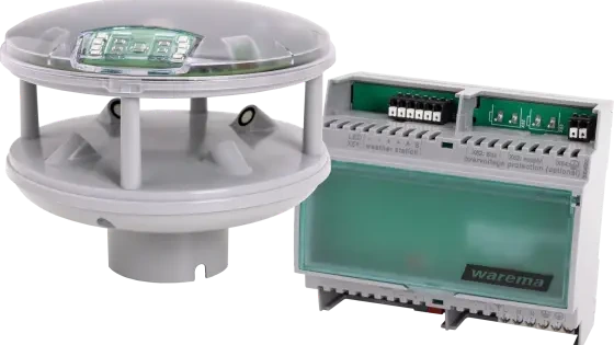 Développée par Warema Renkhoff SE, cette station météo KNX professionnelle analyse en temps réel le vent, la luminosité, la température et la pluie afin d’adapter automatiquement les protections solaires du bâtiment.